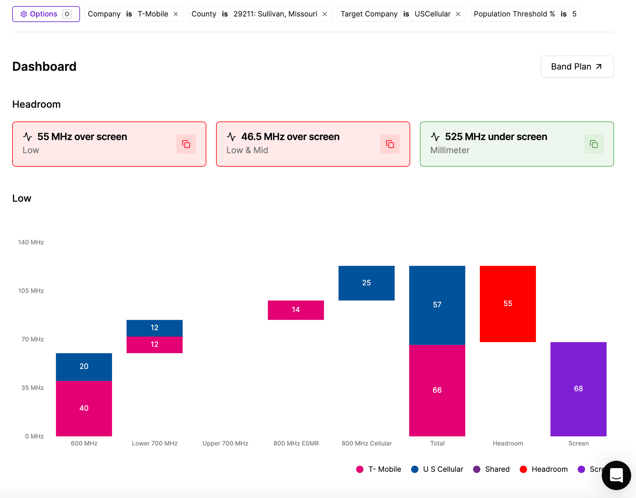 Aggregate spectrum holdings with advanced filters to compare spectrum holdings across multiple dimensions. Get weighted MHz and MHz-Pop's broken down by band and market.