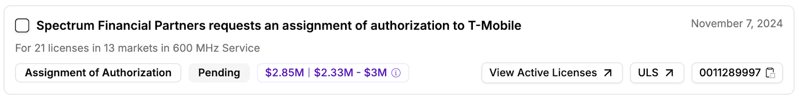 While customers could answer specific questions with our tooling, understanding the worth of assets, even directionally, required additional steps. Users could view MHz-Pop instantly across any market or band, but more than MHz-Pop is needed when working across low, mid, and high band frequencies because portfolios heavier in mmWave licenses skew the results. On a purely MHz-Pop basis, GeoLinks is the 5th largest spectrum owner in the country. But their portfolio isn’t estimated today at more than $700M. Normalizing ownership across value would help teams analyze licenses, transactions, and portfolios more effectively.