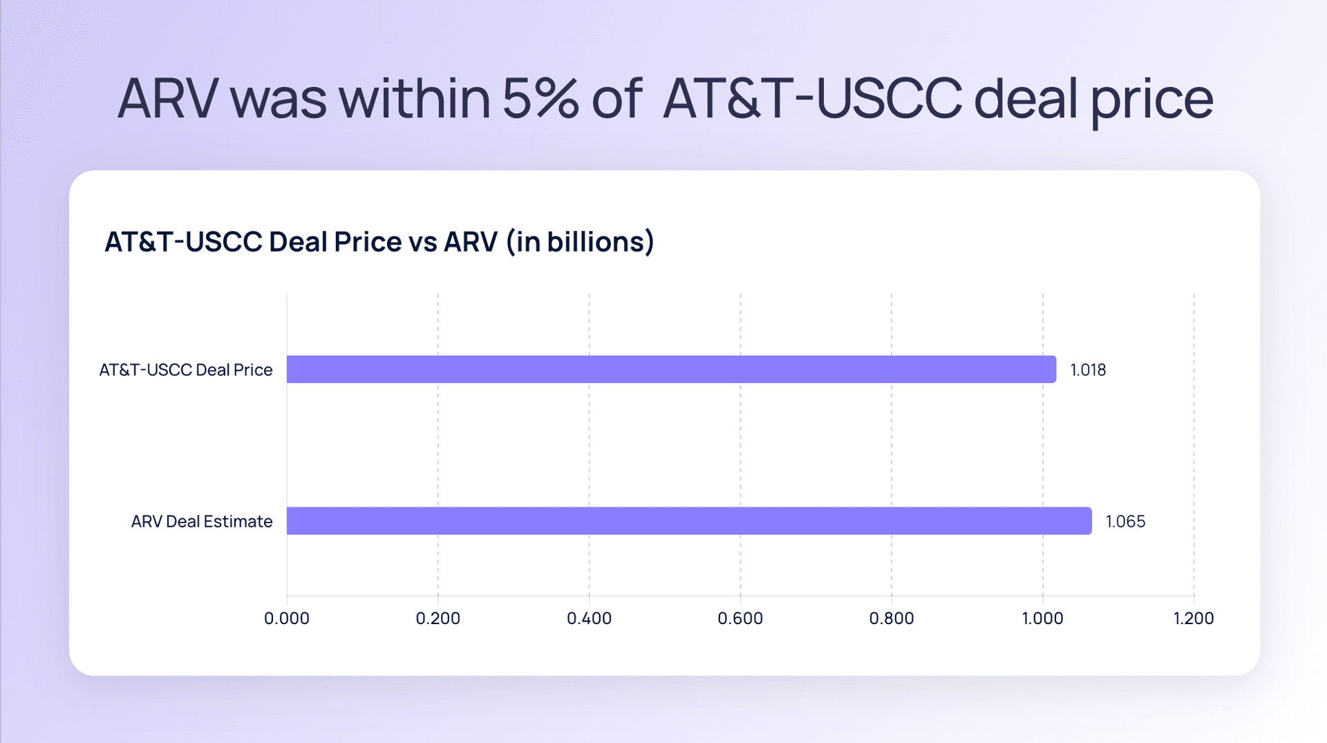 In the recent AT&T-USCC deal, the ARV model estimated the price within 5% of the closing price. Based on a press release, the deal closed at $1.018B. The assets transferred are all of USCC’s 700L B and C block licenses as well as their 3.45 GHz spectrum.