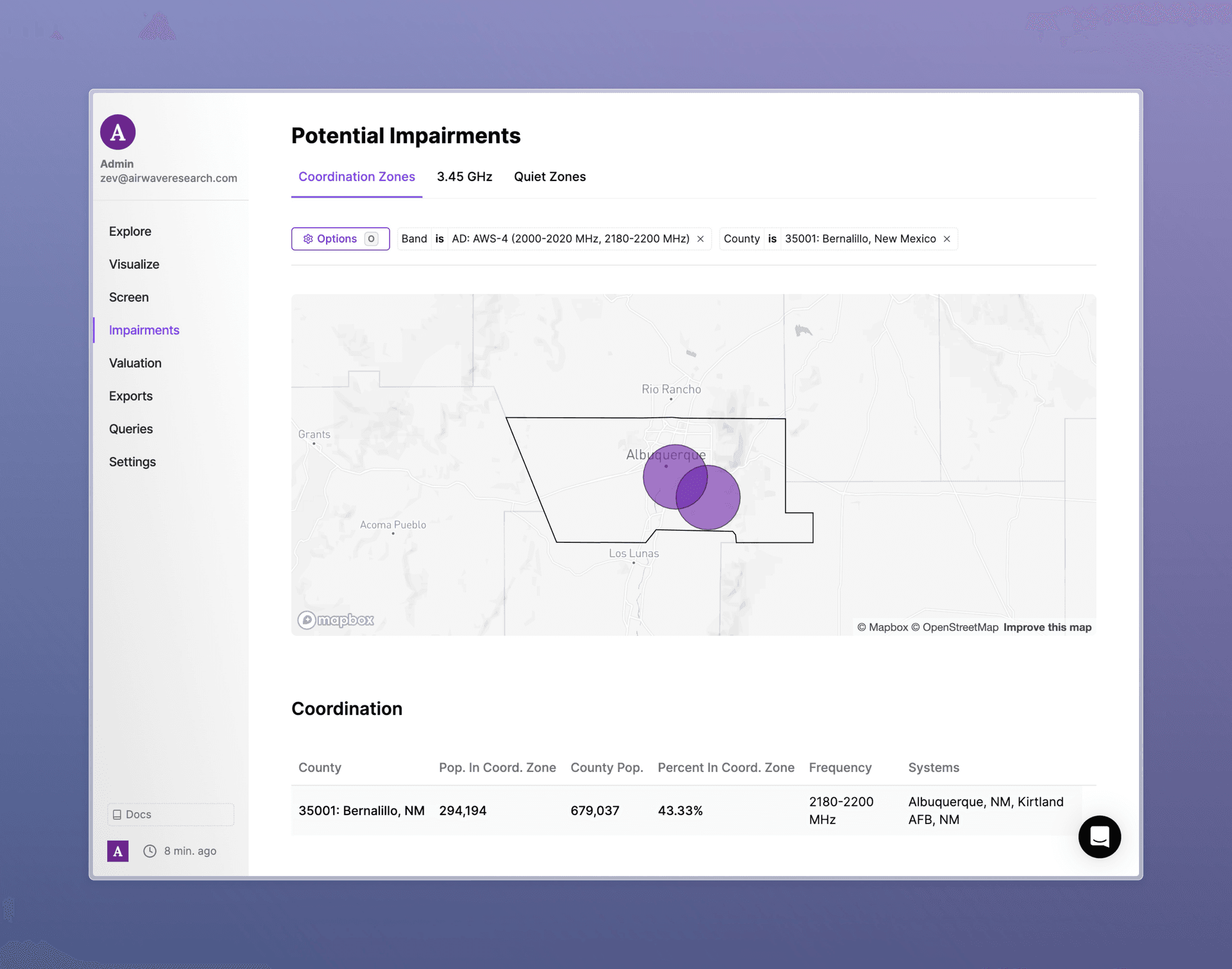 To explore the zones, go to the “Impairments” page on the sidebar, and visit the 3.45 GHz, Protected Zones, or Quiet Zones pages to see the affected areas and frequencies. You can select or search for any county to see which zones overlap.